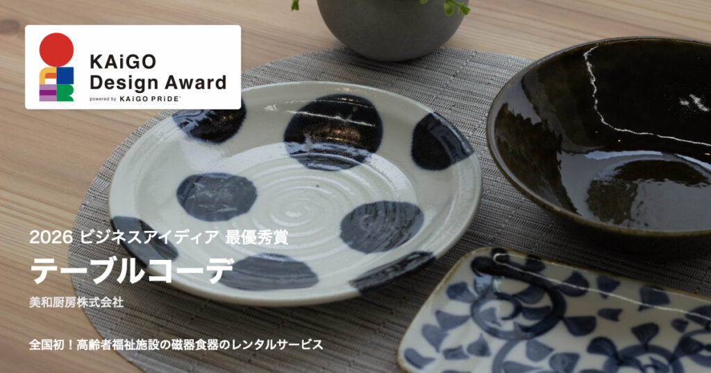 KAiGO Design Award 2026において、ビジネスアイデア部門 最優秀賞を受賞した、三和厨房株式会社の「テーブルコーデ」をご紹介します。 「テーブルコーデ」は、高齢者福祉施設向けに開発された磁器食器のレンタルサービスです。 食器の購入・管理・廃棄といった施設側の負担を軽減しながら、美しい器によって高齢者の「食べる喜び」を支える新しい仕組みとして注目を集めています。 厨房会社として培ってきた集団給食の知見を活かし、すべての食器に水切り加工を施すなど、衛生面にも配慮。さらに、破損に備えた予備食器をあらかじめセットで提供することで、日常運用における安心感も担保されています。 利用者にとっては、器が変わることで食事そのものの楽しみが増し、日々の生活に彩りが生まれます。 一方で施設側にとっては、管理負担の軽減と安定した運用の両立が可能となり、現場における実装性の高さも特徴の一つです。 また、三和厨房株式会社は今回の受賞にあわせて、自社サイトにて紹介記事を公開しています。 ▼三和厨房株式会社 紹介記事 https://www.sanwa-chubo.com/table/2026/03/03/blog/382/ 審査においては、食環境の質向上と運用負担軽減を同時に実現している点が高く評価されました。 また、食事を「栄養摂取」から「生活の楽しみ」へと再定義し、施設文化そのものに変化をもたらす可能性がある点も注目されています。 これは単なる食器サービスにとどまらず、日常の中にある「食べる時間」の価値を見つめ直し、利用者と施設双方に新たな体験をもたらす取り組みです。 三和厨房株式会社は今回の受賞に際し、 「施設入居者にとって一日の大きな楽しみである食事の時間を美しく、より楽しみなものにしたいという想いから生まれました。今回の受賞を励みに、施設の食事がより楽しみな時間になる環境づくりを広げてまいります」 とコメントしています。 今後は、こうした取り組みを全国へと広げながら、介護施設における新たな食のあり方の定着が期待されます。 <KAiGO Design Awardとは・・・> KAiGO Design Awardは、介護・ヘルスケア領域において、現場の課題を起点に生まれたプロダクトやアイデア、テクノロジー、表現を評価し、社会実装へとつなげることを目的としたアワードです。 現役介護職と企業・専門家がともに審査に関わり、「売る側」と「使う側」の両視点から価値を見極めながら、すべての人のポジティブ・ライフに貢献する取り組みにスポットライトを当てています。 KAiGO Design Award 2026公式Webサイトでは、審査の視点や選考プロセス、受賞プロダクトの詳細など、本アワードの全体像をご覧いただけます。 https://kaigopride.jp/kda